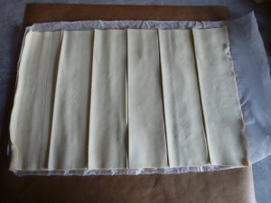 • Den Blätterteig schneidet ihr in 6 Streifen