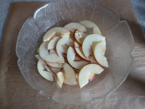 • Die Apfelscheiben in eine Schale mit Wasser legen und für ca 3 Minuten in die Mikrowelle