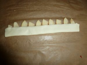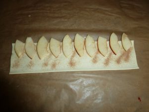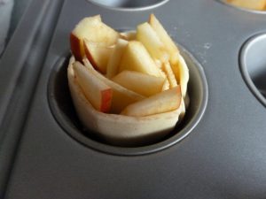 • Dann die Apfelscheiben auf die obere Hälfte schichten, den Blätterteig umklappen und alles zusammenrollen. Dann in eine Muffinform stellen