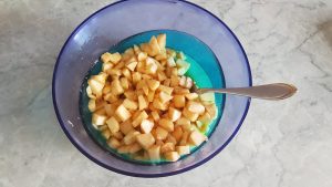 • In einer Schüssel die Apfelstücke mit Zimt, 3 EL Zucker, Vanillepulver und Zitronensaft verrühren