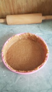 • Nehmt nach der Ruhezeit die größere Kugel Teig aus dem Kühlschrank und rollt sie rund aus. In der Form sollte auch ein hoher Teigrand entstehen!