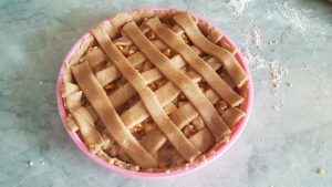 • Die zweite Teig-Kugel wird zum "Deckel" für die Torte. Hier könnt ihr, wie ich, ein Gitter bauen. Oder ihr stecht mit dem Plätzchen-Ausstecher Formen, die ihr auf der Apfelmasse verteilt. Was euch besser gefällt