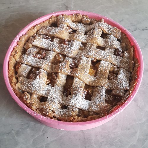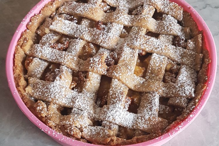 Es handelt sich dabei um einen Mürbeteig mit Apfelfüllung. Karamellisierte Walnüsse verleihen ihm ein bisschen Crunch.