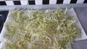 • Die Holunderblütendolden am Besten im Freien schon kurz ausschütteln, um so die ersten Insekten zu entfernen. Danach in stehendem Wasser kurz schwenken und auf einem Küchentuch trocknen lassen. Dabei geht leider auch etwas von dem Blütenstaub verloren, aber so werdet ihr nochmal ein paar Insekten los