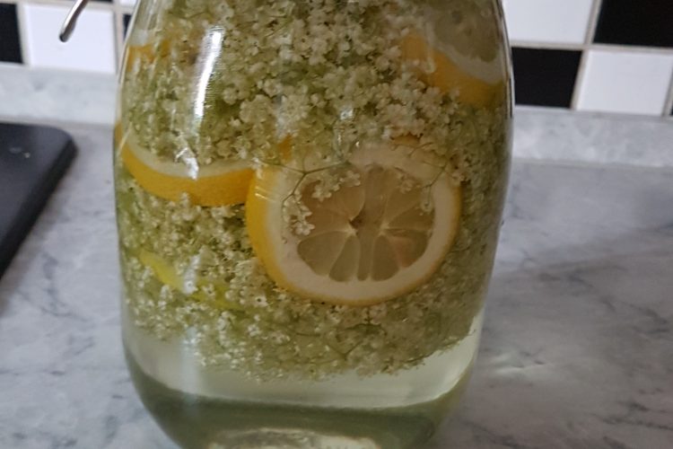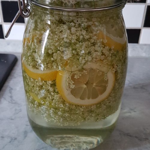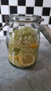 • Den abgekühlten Sirup über die Blüten und Zitronenscheiben gießen und das Gefäß verschließen