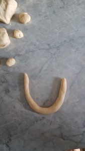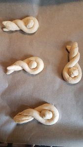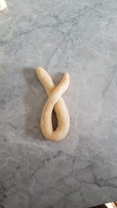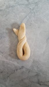 - Den Teig für den Körper rollt ihr in eine Schlange formen. Diese dann an den Enden hochnehmen, die Enden zusammenlegen und 1-2x eindrehen